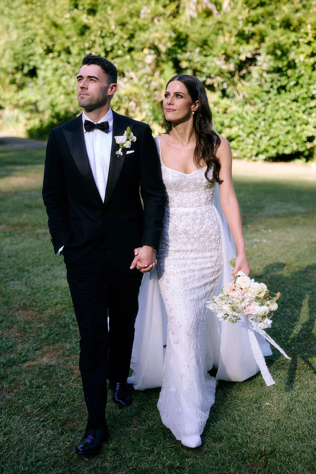 A: Classic tux with peaked lapels. I wanted something classic and timeless, a simple, elegant tux which would look great when we’re old, looking back on our special day.